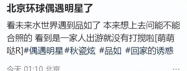 4月3日,有北京网友分享出在环球影城偶遇到秋瓷炫于晓光一家三口动态。该网友还激动附文写道:“看未来水世界遇到品如了”,不过,因为是私人行程,夫妻俩还带着孩子,所以,网友并没有上前要合影打扰一家三口幸福时光。
